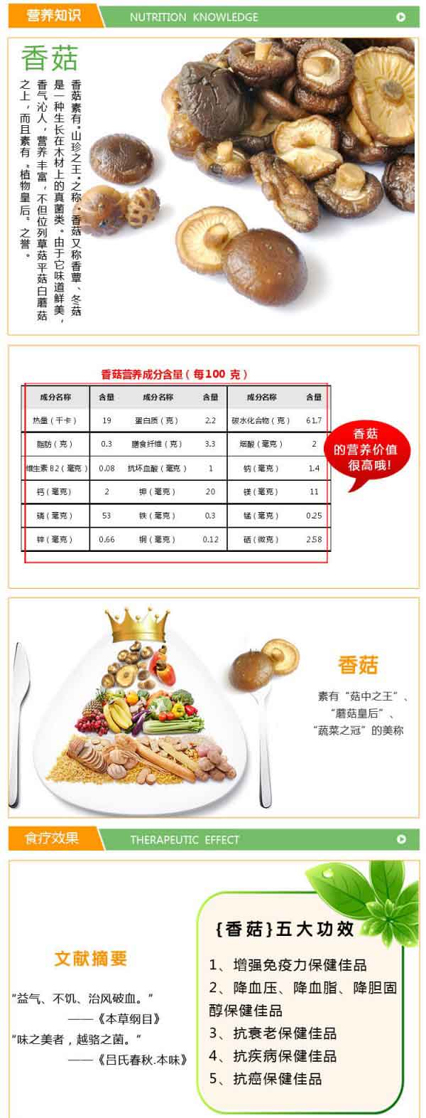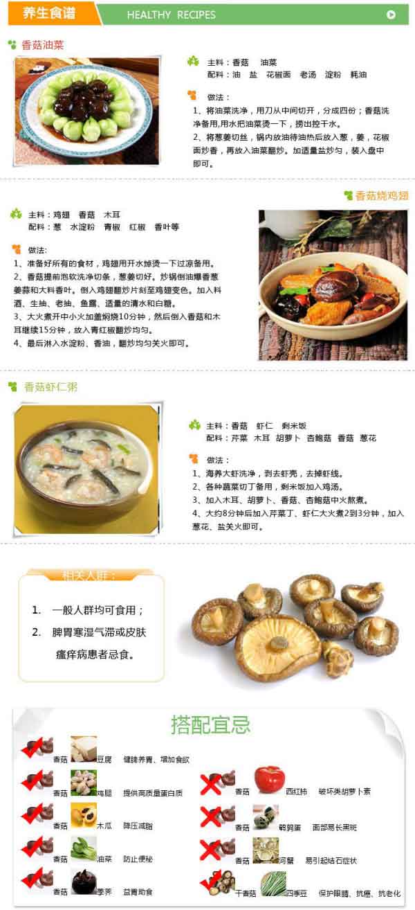 香菇含有一种分子量为100万的抗肿瘤成分-----香菇多糖,含有降低血脂的成分-----香菇太生,香菇腺嘌呤和腺嘌呤的衍生物,香菇还含有抗病毒的成分------干扰素的诱发剂----双链核糖核酸,是不可多得的保健食品之一。