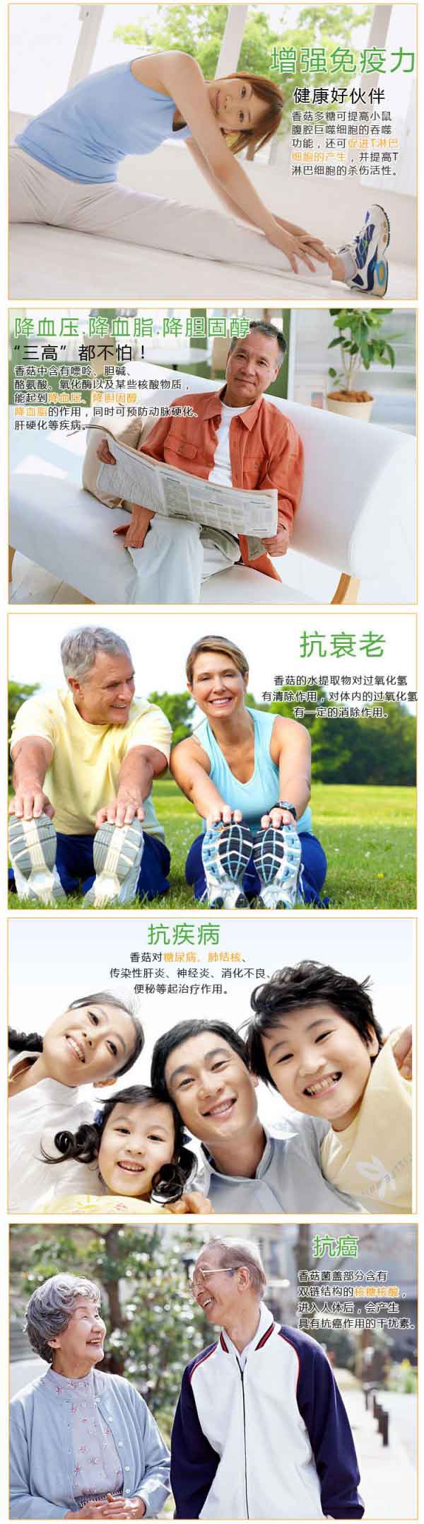香菇多糖能提高辅助性T 细胞的活力而增强人体体液免疫功能。大量实践证明,香菇防治癌症的范围广泛,已用于临床治疗。香菇还含有多种维生素、矿物质,对促进人体新陈代谢,提高机体适应力有很大作用。香菇还对糖尿病、肺结核、传染性肝炎、神经炎等起治疗作用,又可用于消化不良、便秘、减肥等。我国不少古籍中记载香菇“益气不饥,治风破血和益胃助食”。民间用来助痘疮、麻疹的诱发,治头痛、头晕。